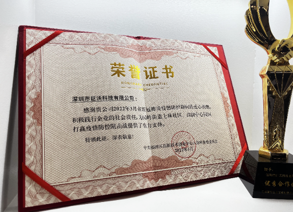 2022年3月,巨沃科技在新冠肺炎疫情防控期間進(jìn)行愛心捐贈(zèng),積極踐行企業(yè)的社會(huì)責(zé)任,為深圳市福田區(qū)園嶺街道上梅林社區(qū)、高創(chuàng)中心園區(qū)打贏疫情防控阻擊戰(zhàn)提供了有力支持,獲得福田區(qū)高創(chuàng)中心八卦嶺基地委員會(huì)頒發(fā)的榮譽(yù)證書。